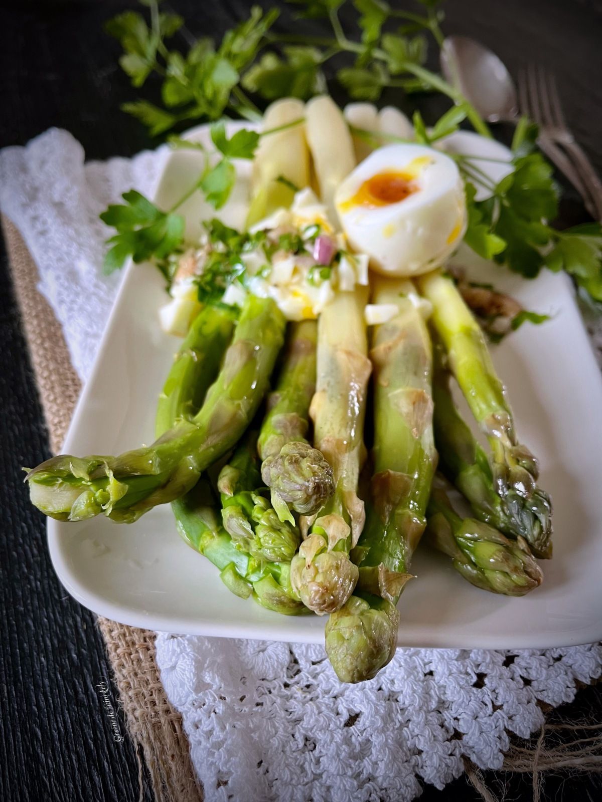 - Versez la vinaigrette sur les branches d'asperges et déposez joliment dessus les moitiés d'oeufs que vous avez réservés, la salade d'asperges est prête, RÉGALEZ-VOUS!